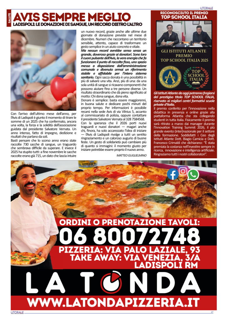 L’AVIS di Ladispoli rivolge a tutti un sentito ringraziamento e l’augurio di buone feste, con la speranza che il 2026 porti nuovi traguardi e, soprattutto, nuovi donatori pronti a fare la differenza.
