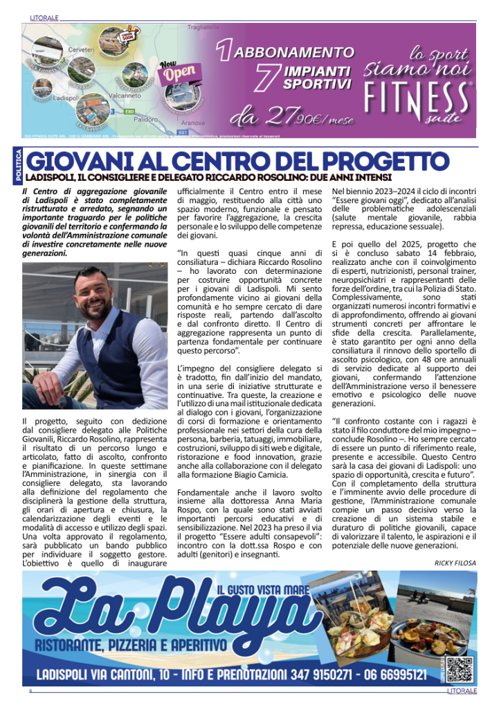 “Il confronto costante con i ragazzi è stato il filo conduttore del mio impegno – conclude Rosolino –. Ho sempre cercato di essere un punto di riferimento reale. Questo Centro sarà la casa dei giovani di Ladispoli: uno spazio di opportunità, crescita e futuro”.