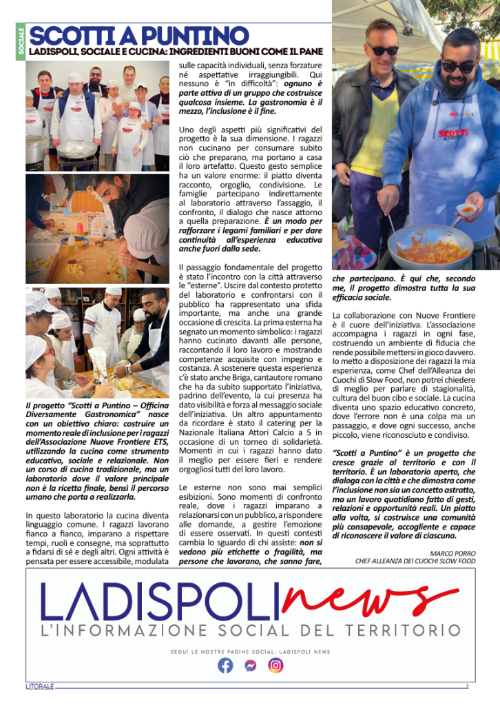 Il progetto “Scotti a Puntino – Officina Diversamente Gastronomica” nasce con un obiettivo chiaro: costruire un momento reale di inclusione per i ragazzi dell’Associazione Nuove Frontiere ETS, utilizzando la cucina come strumento educativo, sociale e relazionale.