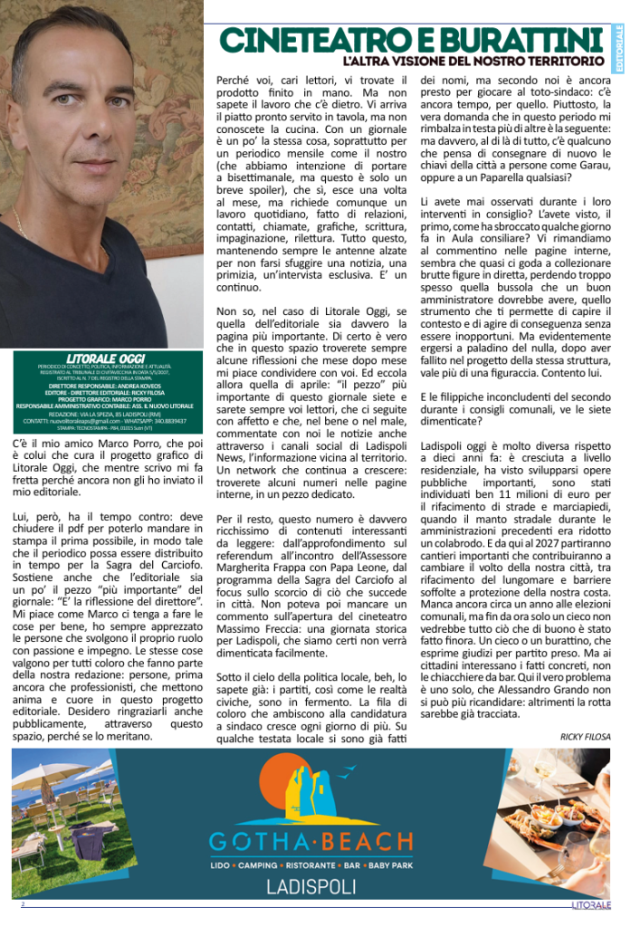 Non so, nel caso di Litorale Oggi, se quella dell’editoriale sia davvero la pagina più importante. Di certo è vero che in questo spazio troverete sempre alcune riflessioni che mese dopo mese mi piace condividere con voi. Ed eccola allora quella di aprile: “il pezzo” più importante di questo giornale siete e sarete sempre voi lettori, che ci seguite con affetto e che, nel bene o nel male, commentate con noi le notizie anche attraverso i canali social di Ladispoli News, l’informazione vicina al territorio. Un network che continua a crescere: troverete alcuni numeri nelle pagine interne, in un pezzo dedicato.