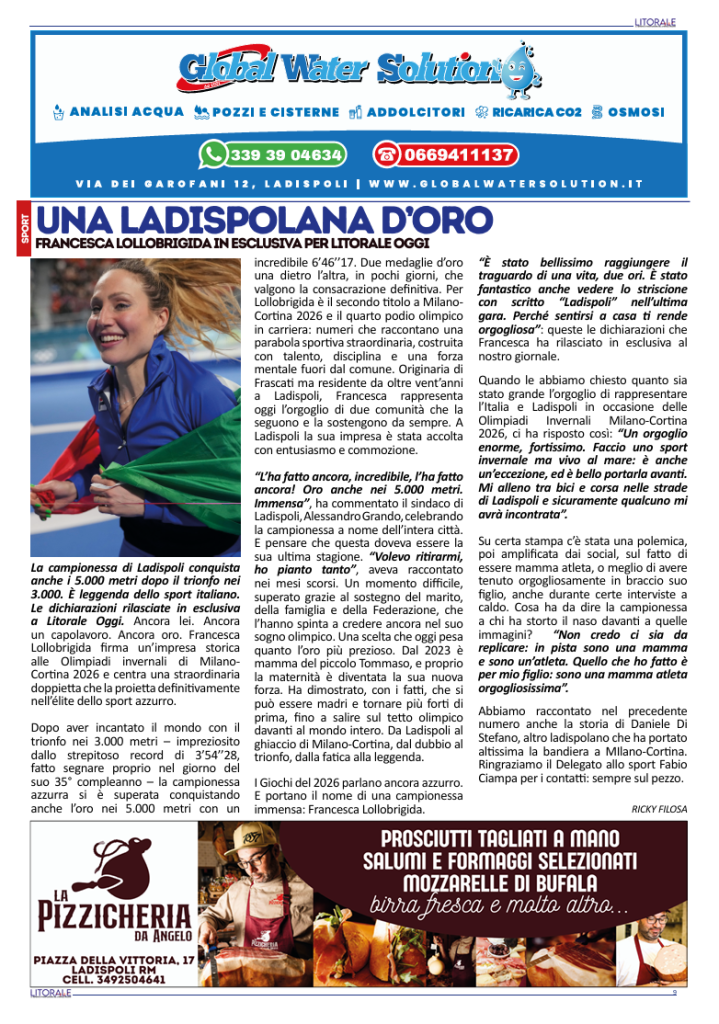 Per Lollobrigida è il secondo titolo a Milano-Cortina 2026 e il quarto podio olimpico in carriera: numeri che raccontano una parabola sportiva straordinaria, costruita con talento, disciplina e una forza mentale fuori dal comune. Originaria di Frascati ma residente da oltre vent’anni a Ladispoli, Francesca rappresenta oggi l’orgoglio di due comunità che la seguono e la sostengono da sempre. A Ladispoli la sua impresa è stata accolta con entusiasmo e commozione.