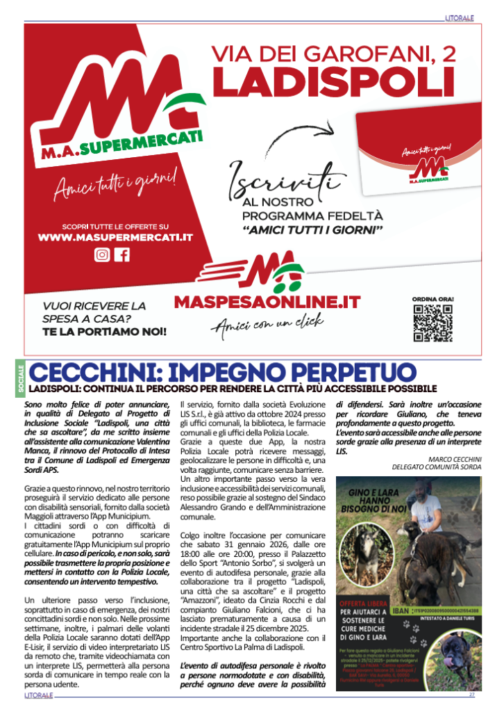 In qualità di Delegato al Progetto di Inclusione Sociale “Ladispoli, una città che sa ascoltare”, da me scritto insieme all’assistente alla comunicazione Valentina Manca, sono molto felice di poter annunciare il rinnovo del Protocollo di Intesa tra il Comune di Ladispoli ed Emergenza Sordi APS.