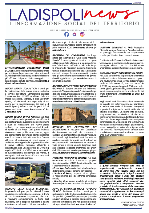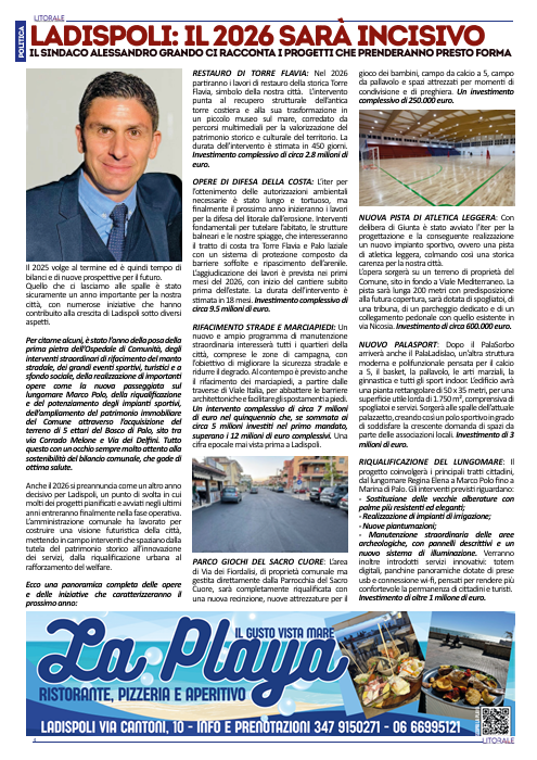 Anche il 2026 si preannuncia come un altro anno decisivo per Ladispoli, un punto di svolta in cui molti dei progetti pianificati e avviati negli ultimi anni entreranno finalmente nella fase operativa.