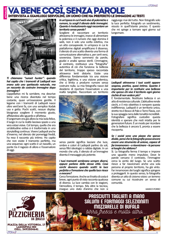 Ladispoli è un territorio unico, stretto tra il Bosco di Palo e Torre Flavia, con la sua spiaggia nera dalle tonalità incredibili. Fotografare significa custodire questa identità e sperare che resti intatta per le generazioni future. È un modo per ricordare che la bellezza è ancora lì, pronta a essere riscoperta.