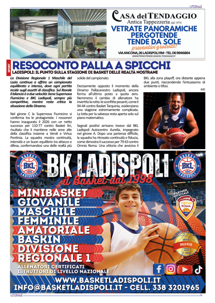 Decisamente opposto il momento della Dinamo Pallacanestro Ladispoli, ancora ferma all’ultimo posto a quota zero. Nemmeno il cambio di allenatore ha invertito la rotta: le sconfitte pesanti, come il 94-44 contro Basket Tarquinia, evidenziano una stagione estremamente complicata. La lotta per la salvezza resta aperta solo sul piano matematico.