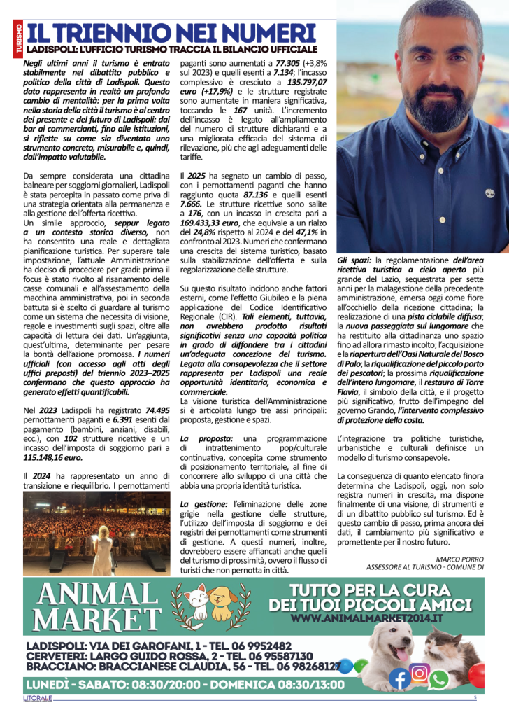 Su questo risultato incidono anche fattori esterni, come l’effetto Giubileo e la piena applicazione del Codice Identificativo Regionale (CIR). Tali elementi, tuttavia, non avrebbero prodotto risultati significativi senza una capacità politica in grado di diffondere tra i cittadini un’adeguata concezione del turismo, legata alla consapevolezza che il settore rappresenta per Ladispoli una reale opportunità identitaria, economica e commerciale.