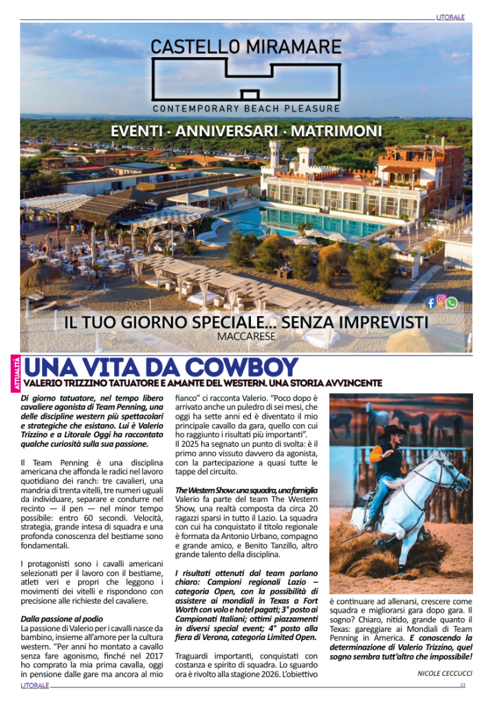 Di giorno tatuatore, nel tempo libero cavaliere agonista di Team Penning, una delle discipline western più spettacolari e strategiche che esistano. Lui è Valerio Trizzino e a Litorale Oggi ha raccontato qualche curiosità sulla sua passione.