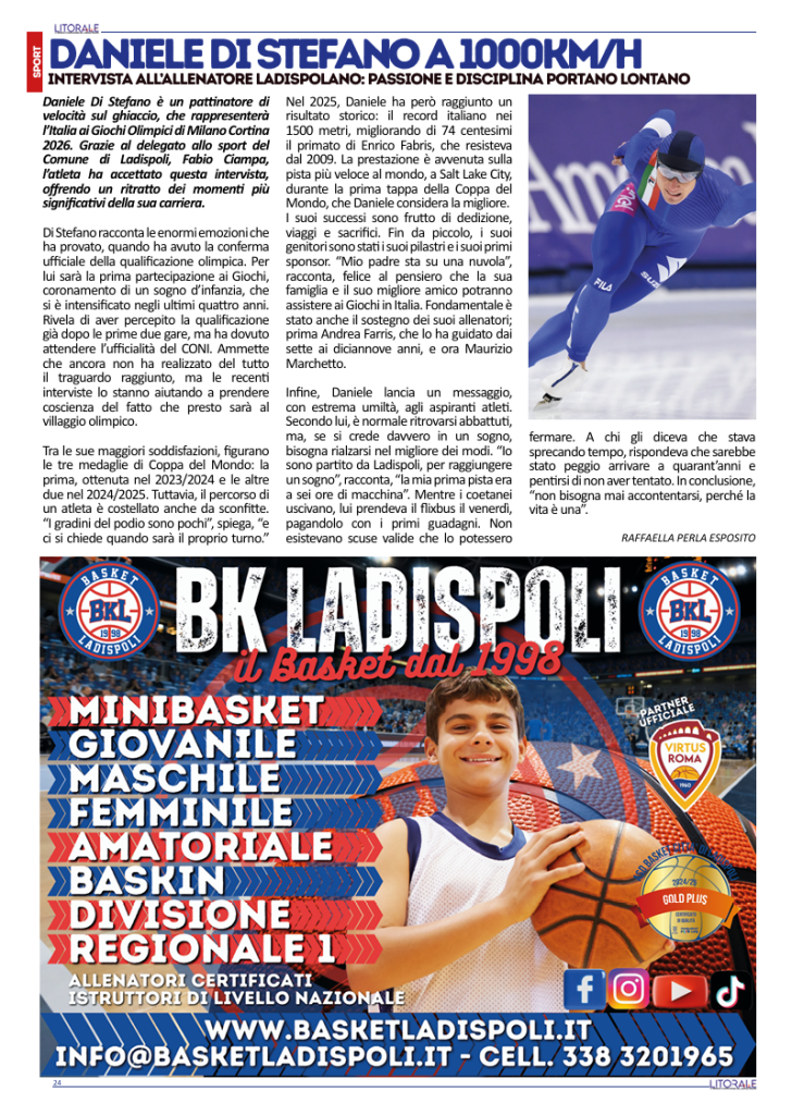 Daniele Di Stefano è un pattinatore di velocità sul ghiaccio, che rappresenterà l’Italia ai Giochi Olimpici di Milano Cortina 2026. Grazie al delegato allo sport del Comune di Ladispoli, Fabio Ciampa, l’atleta ha accettato questa intervista, offrendo un ritratto dei momenti più significativi della sua carriera.